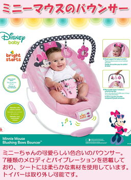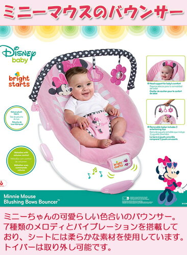 Bright Starts ブライトスターツ ミニーマウス ブラッシングボーズ バウンサー Bright Starts ミニーマウス バウンサーミニーちゃんのピンクとブラックの色合いがとってもかわいいバウンサー!7種類のメロディとバイブレーションを搭載しており、シートにはとても柔らかな素材を使用しています。