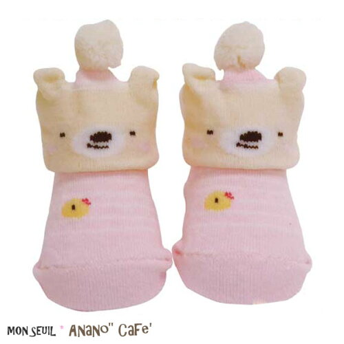 そんなアナノカフェシリーズから今回は、とんがり帽子のベアの顔がポイントのベビーカップベアソックスの登場です! 両足にヒヨコがちょこんとプリントしてあります。